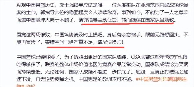 中国男篮虽然在亚洲杯勇夺亚军,一时获得人们的掌声,好评如潮。但是时隔三个月,中国队判若两队,完全变了样,来到世预赛小组赛彻底被韩国队打回原形,两战两败,而且输得十分彻底,开成了一边倒,与韩国队完全不是同一个档次。媒体人和球迷纷纷质疑主帅郭士强指导能力,知名媒体人付政浩更是对他差评,要求郭指导主动让贤,中国男篮尽快换帅。